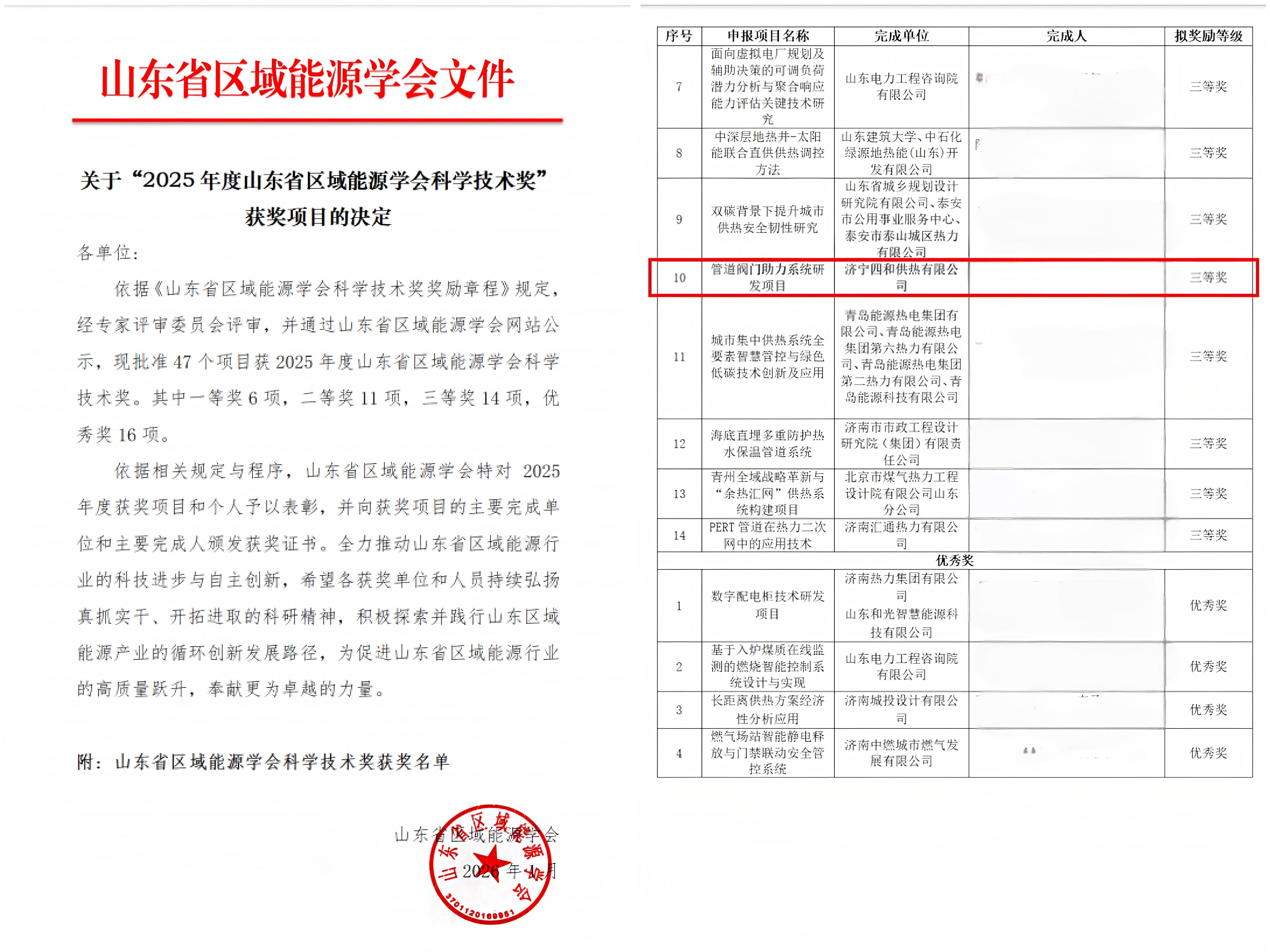 近日,2025年度山東省區(qū)域能源學(xué)會科學(xué)技術(shù)獎(jiǎng)獲獎(jiǎng)項(xiàng)目名單正式公示,濟(jì)寧四和供熱有限公司自主研發(fā)的管道閥門助力系統(tǒng)項(xiàng)目憑借突出的技術(shù)創(chuàng)新與應(yīng)用價(jià)值,成功獲得科學(xué)技術(shù)獎(jiǎng)三等獎(jiǎng),這是對四和供熱公司技術(shù)研發(fā)實(shí)力和成果轉(zhuǎn)化能力的高度認(rèn)可。